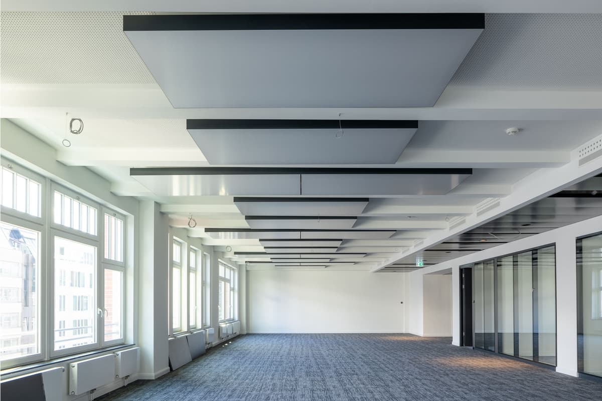 interpanel liefert Deckensegel, die Licht, Akustik, Heizen und eine einzigartige Kühlung für gesundes Raumklima in Gewerbeimmobilien schaffen.