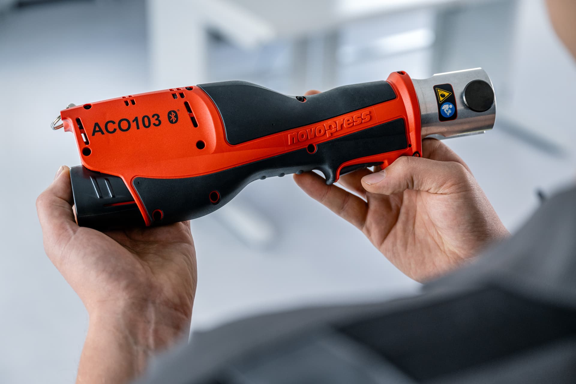 The ACO103 crimping tool has valuable features that make work easier, faster and safer.The LED display under the transparent start button provides information about the battery charge status and shows the status of the crimping tool or any error messages.Thanks to the implemented Bluetooth® technology, device-related data can be called up via the NovoCheck app.